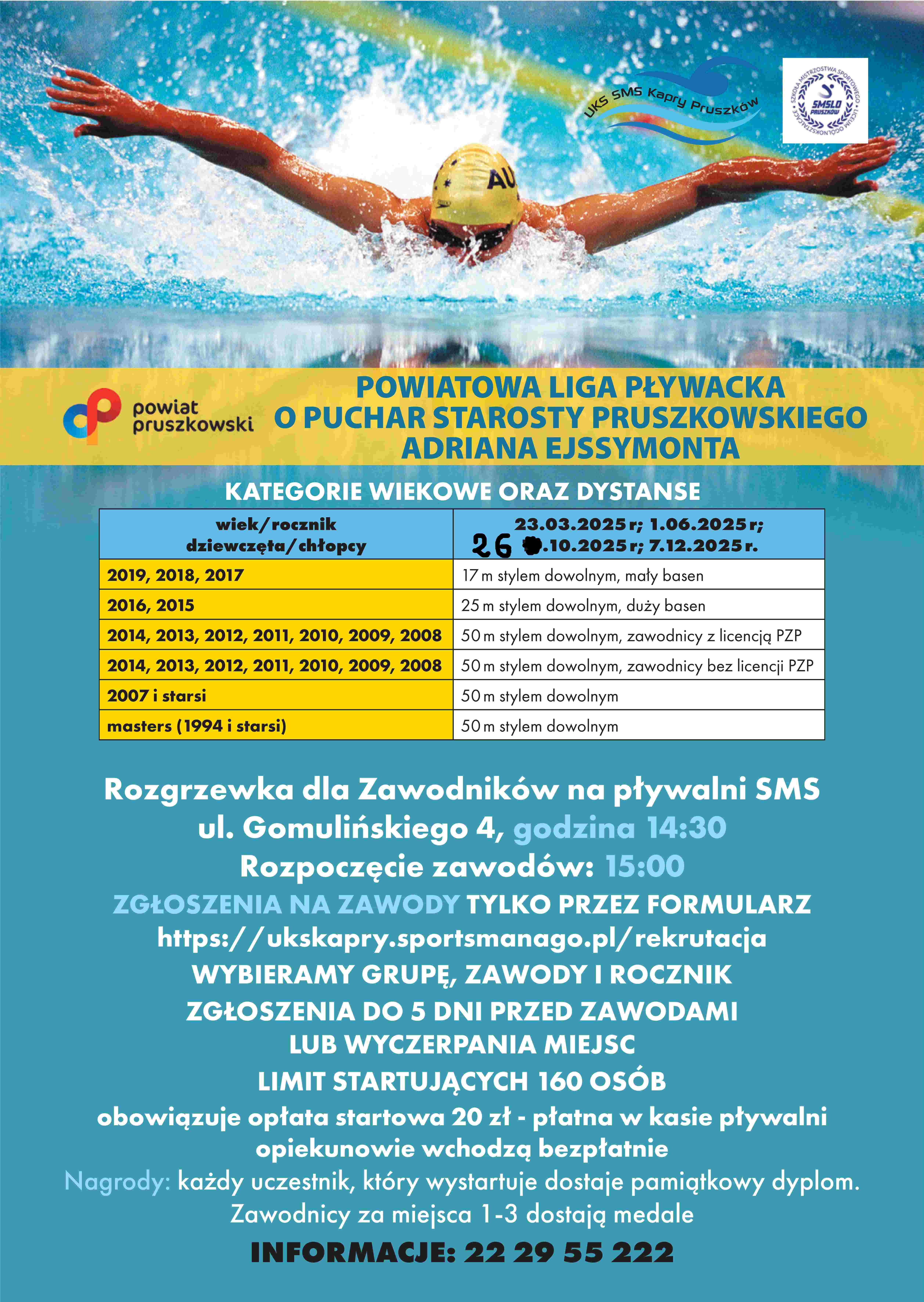 POWIATOWA LIGA PŁYWACKA 26.10.2025 ( NIEDZIELA )   PŁYWLANIA SMS PRUSZKÓW UL. GOMULIŃSKIEGO 4    UWAGA : LIMIT MIEJSC NA ZAWODACH 160 osób. Liczy się kolejność zgłoszeń.  opłata startowa 20 zł w kasie pływlani w...